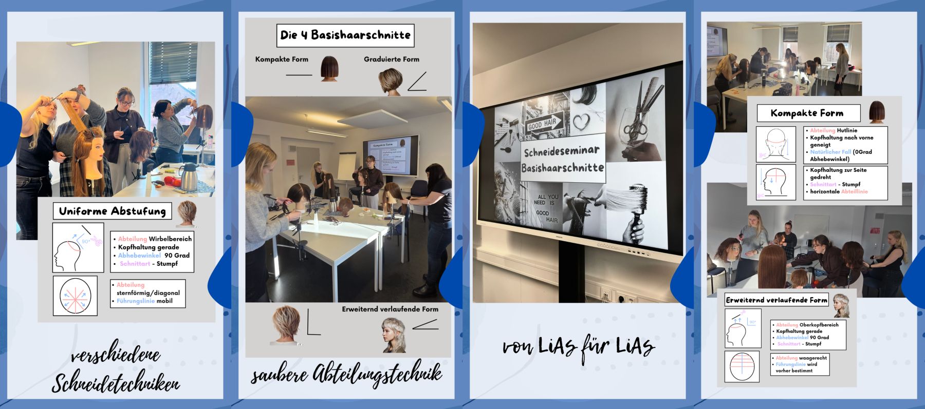 So gestalten die Lehrkräfte in Ausbildung ihren Seminartag in der Kosmetologie. Fachpraxis und Fachtheorie arbeiten dabei Hand in Hand und profitieren voneinander. Unter fachkundiger Anleitung der Friseurmeisterin Paula erproben die angehenden Lehrkräfte mit vollem Elan die Grundhaarschnitte an Trainingsköpfen. Denn nur, wer die Komplexität des Handelns versteht, kann diese auch vermitteln.